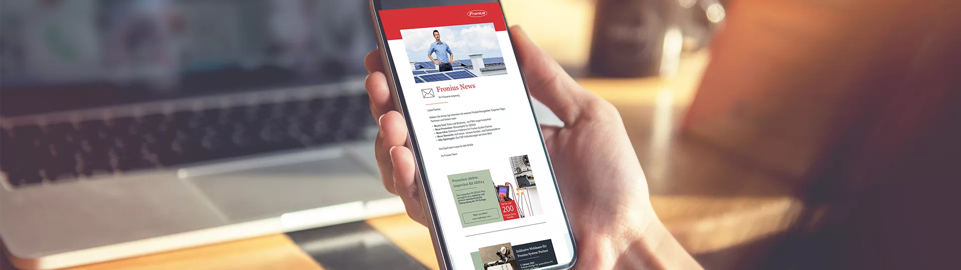 Bleiben Sie mit unserem monatlichen Newsletter für PV-Unternehmen up-to-Date und erhalten Sie immer als erstes die neusten Fronius Informationen. Mit den Fronius News profitieren Sie außerdem von vielen Vorteilen. Erhalten Sie regelmäßige Informationen über Neuheiten aus dem Hause Fronius, Sonderaktionen, wie z.B. Verkaufs- & Rabattaktion und Gewinnspiele, Veranstaltungen & Trainings, Expertentipps, Wissenswertes & Trends aus der PV-Branche.