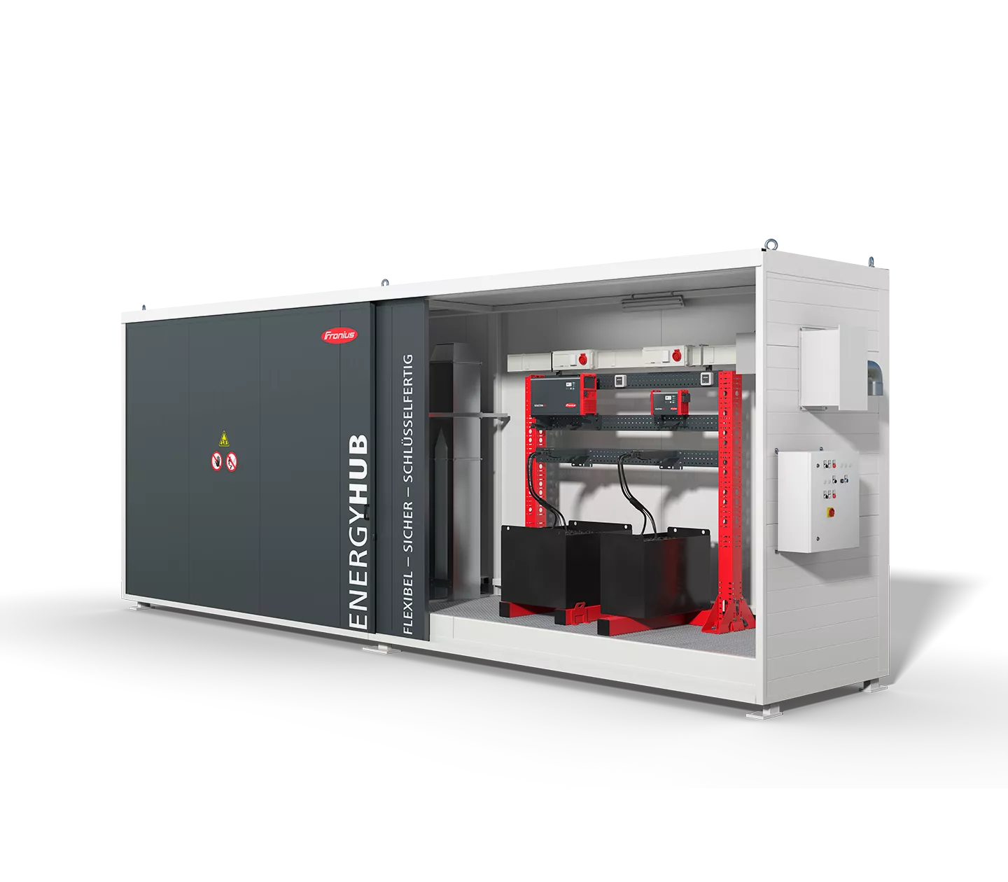 Ab Werk verfügt der Fronius Energy Hub über eine normgerechte Lüftung. Diese wälzt mehrere hundert Kubikmeter Luft pro Stunde um. Mittels eines Luft-Wärmetauschers kann die warme Luft im Container verbleiben. Dadurch kann eine energieeffiziente Belüftung sowie ideale Temperaturen zum Laden sichergestellt werden.