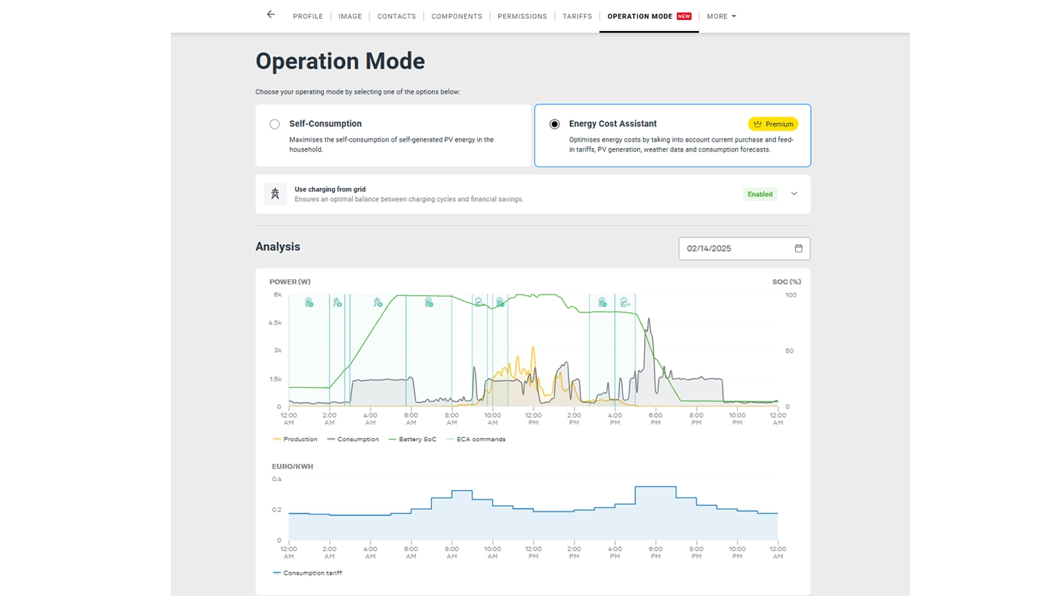 Une fois que l'Energy Cost Assistant a été activé dans le portail Solar.web, il existe une page appelée "Mode de fonctionnement" sur laquelle les utilisateurs peuvent activer et désactiver l'Energy Cost Assistant pour l'installation. L'utilisateur y voit également le fonctionnement (planifié) de la journée en cours et peut savoir quand l'assistant de coûts énergétiques effectuera les vérifications. Un diagramme aide l'utilisateur à comprendre le fonctionnement. Cette page est visible après la première activation pour tous les utilisateurs ayant des droits administrateurs ou de propriétaire du système.