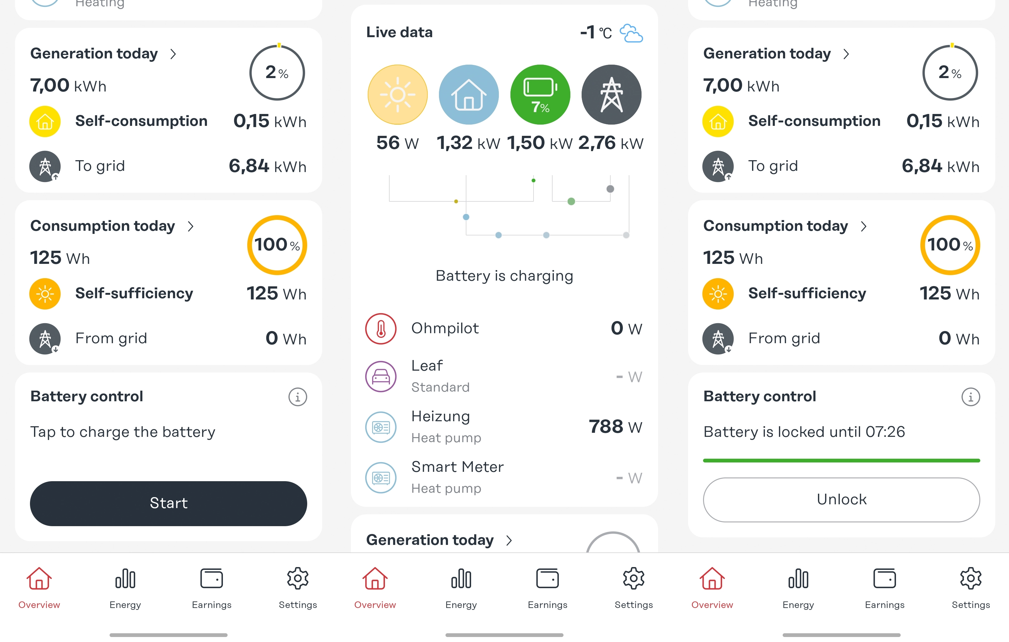 När batterikontrollen är aktiverad laddas batteriet med minst 1,5 kW, oavsett varifrån energin kommer. Detta för att säkerställa att den importerade effekten inte är för hög och överskrider belastningen på hushållssäkringarna i kontrollpanelen. En funktion för att manuellt ställa in nätladdningseffekten är redan planerad.
