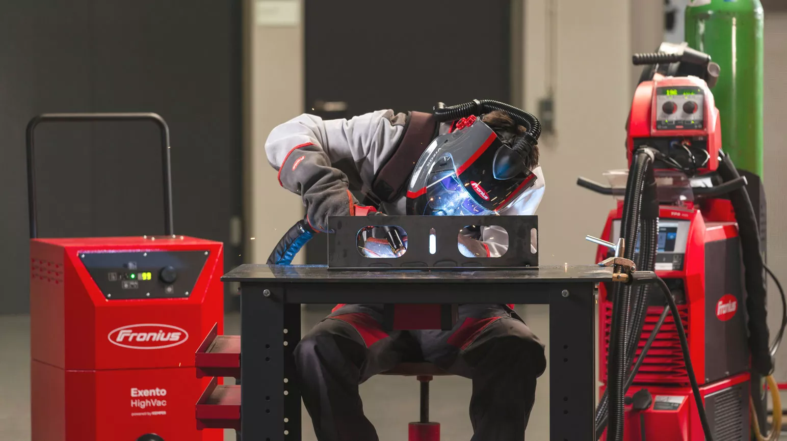 If, on the other hand, the welding process is optimized using arc length correction and a fume extraction torch, such as the Fronius MTW 500i Exento in combination with a Fronius Exento HighVac extraction system, then up to 99% of welding fumes can be extracted.