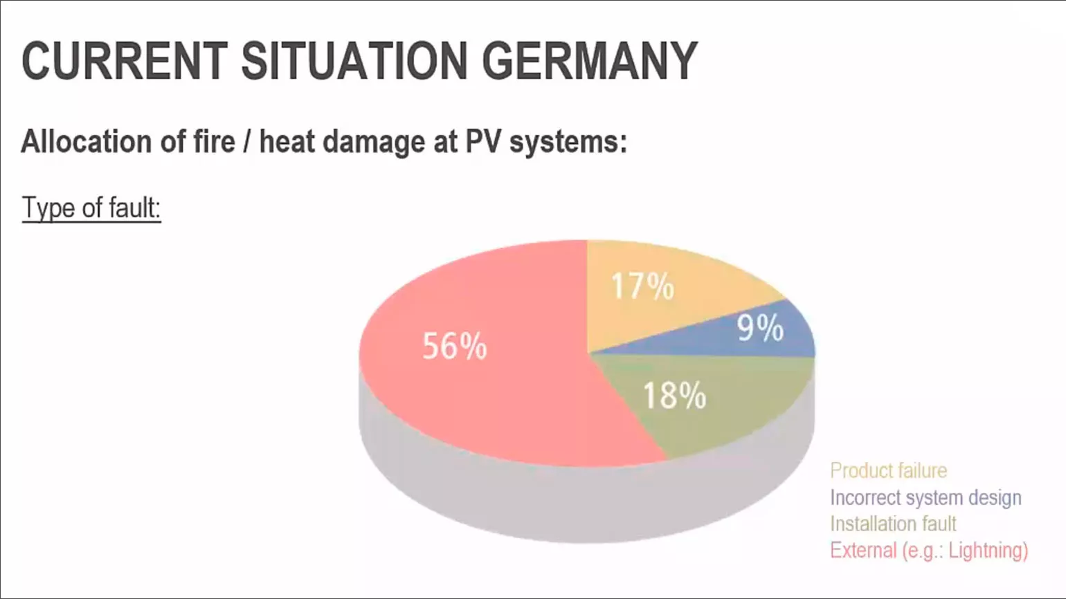 Both studies confirm that, in over 70% of cases involving heat or fire damage, external influences or installation errors were the main causes of fire. Faulty PV-system components were diagnosed as the cause of damage in just 17% (TÜV Rheinland) and 9% (BRE National Solar Centre) of cases.