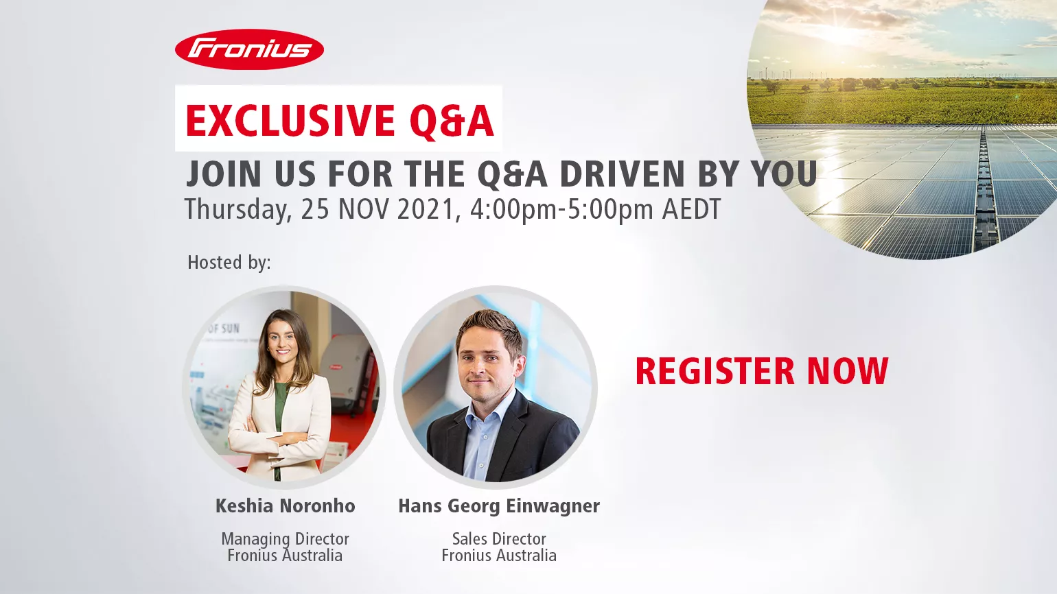 To submit your questions, head to the registration link below and fill it out with the questions you’d like to ask. The first 20 question submissions will also receive a Fronius goodie, so there is no time to waste!