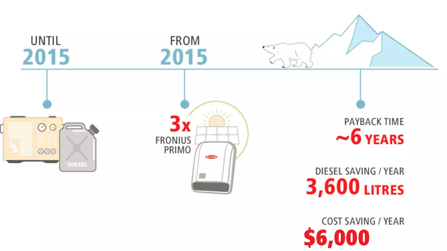 Grid parity of the PV energy is set to be achieved faster than anticipated due to high diesel costs in Sachs Harbour. Consequently, they will have a very low payback time of less than six years, following which the system will be paid off enabling the residents of Sachs Harbour to save more than $115,000 in diesel costs in the first 20 years.