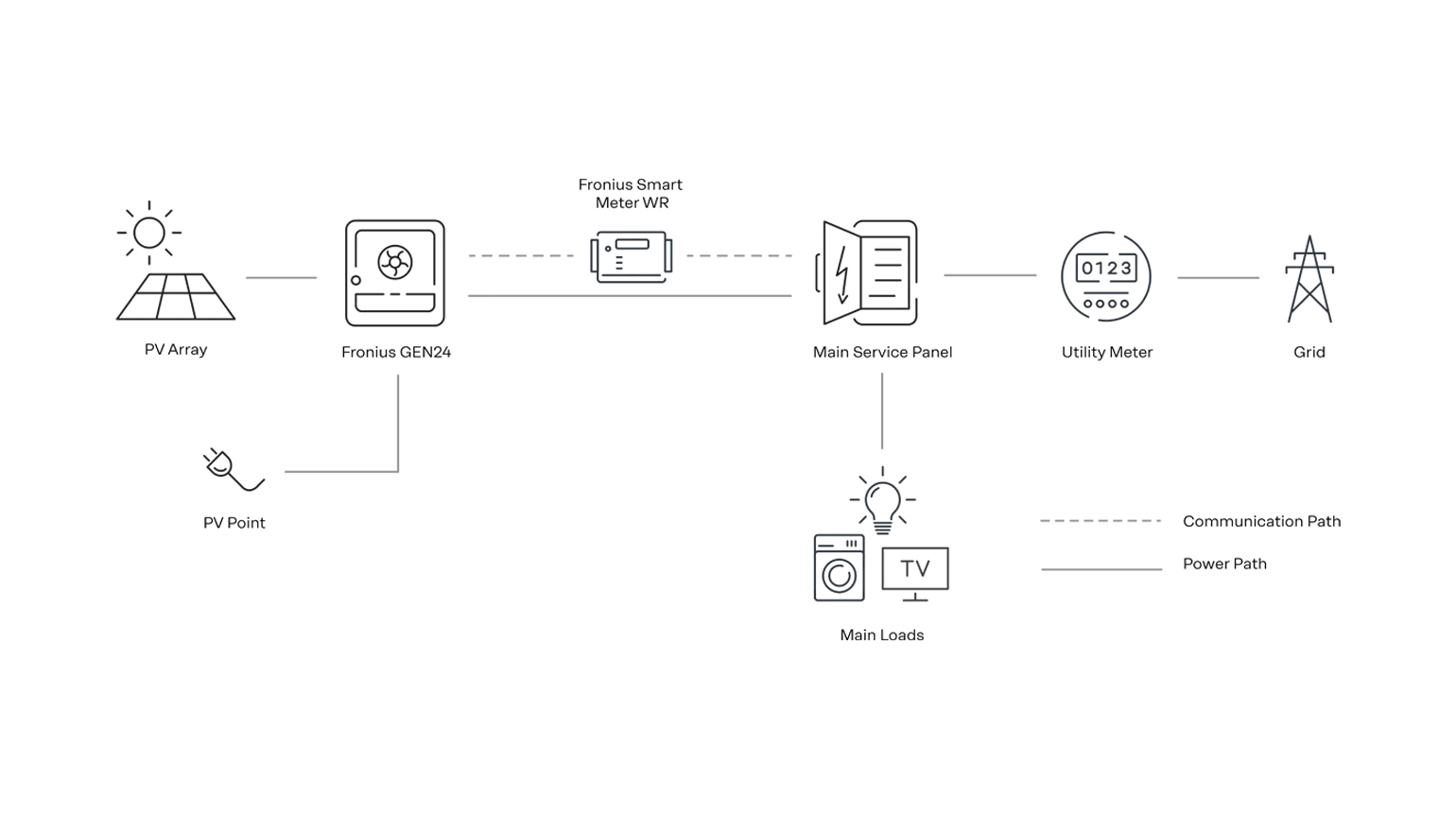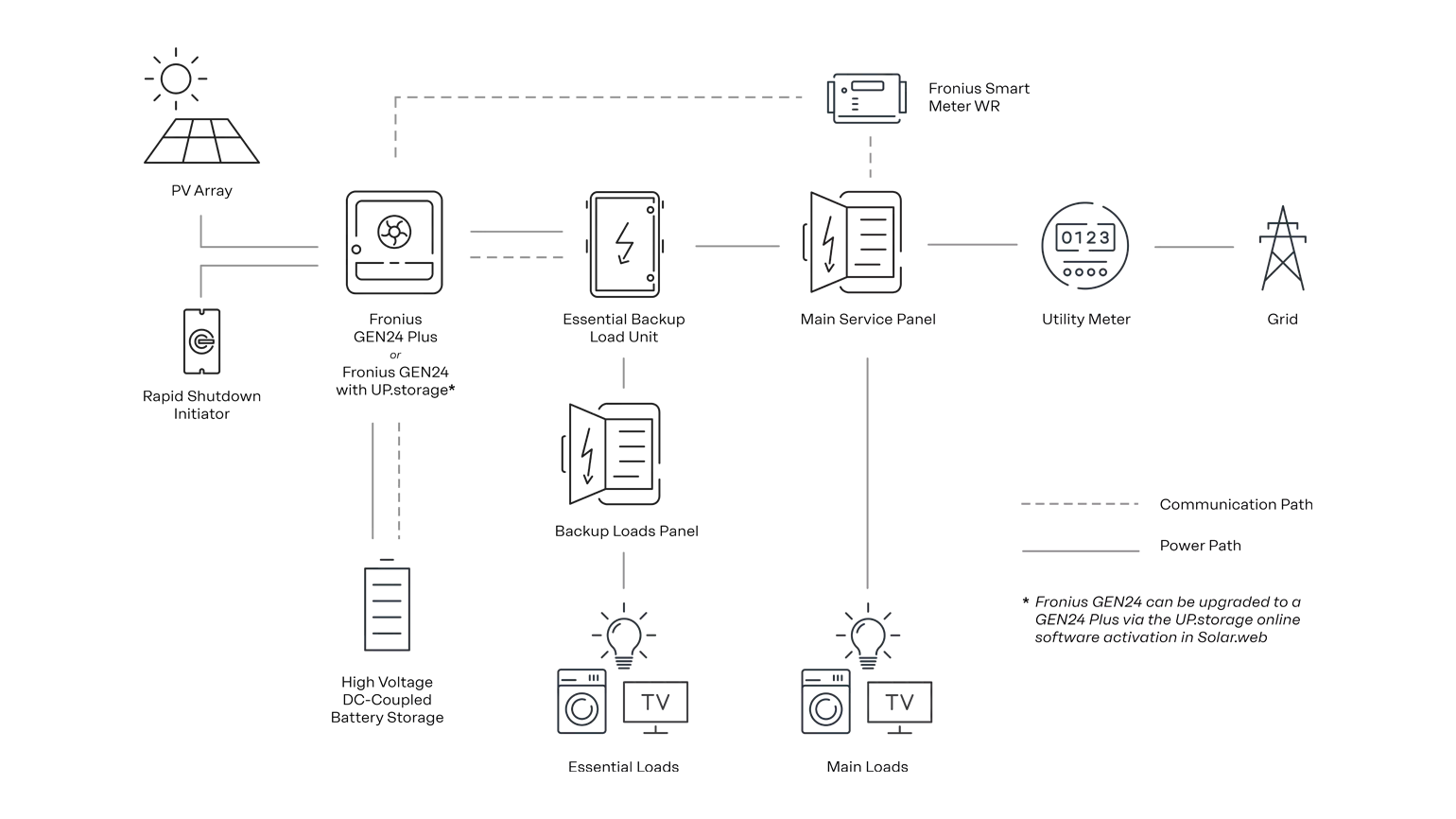 The Fronius Essential Backup Load Unit connects to a breaker within your main distribution panel or fuse box after your first home disconnect. The Essential Backup Load Unit and Fronius GEN24 continually monitor your grid connection using the Fronius Smart Meter WR. When a power outage occurs, your non-essential appliances remain connected to the utility grid. The Essential Backup Load Unit transitions your essential appliances to operating directly on Solar and stored battery energy.