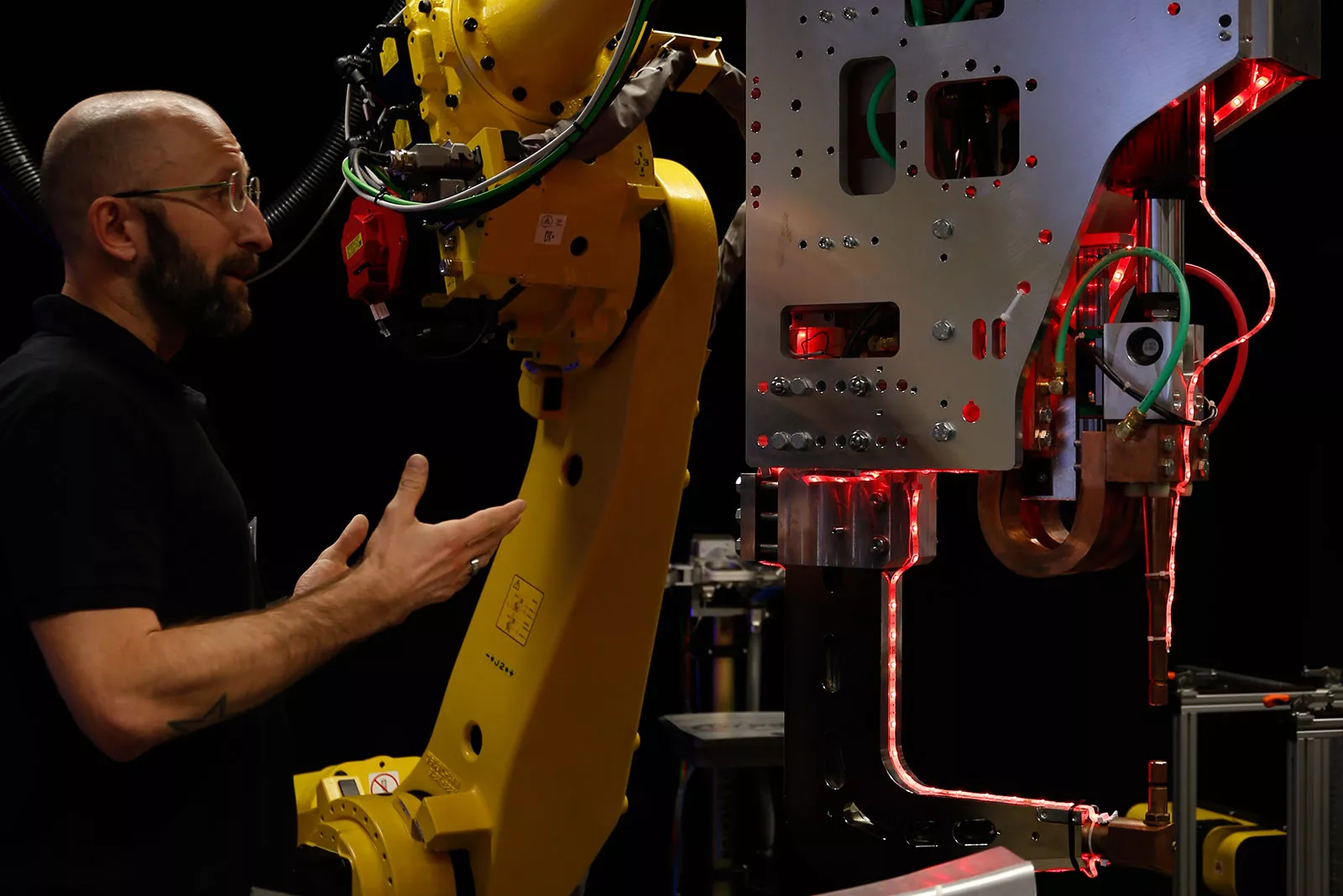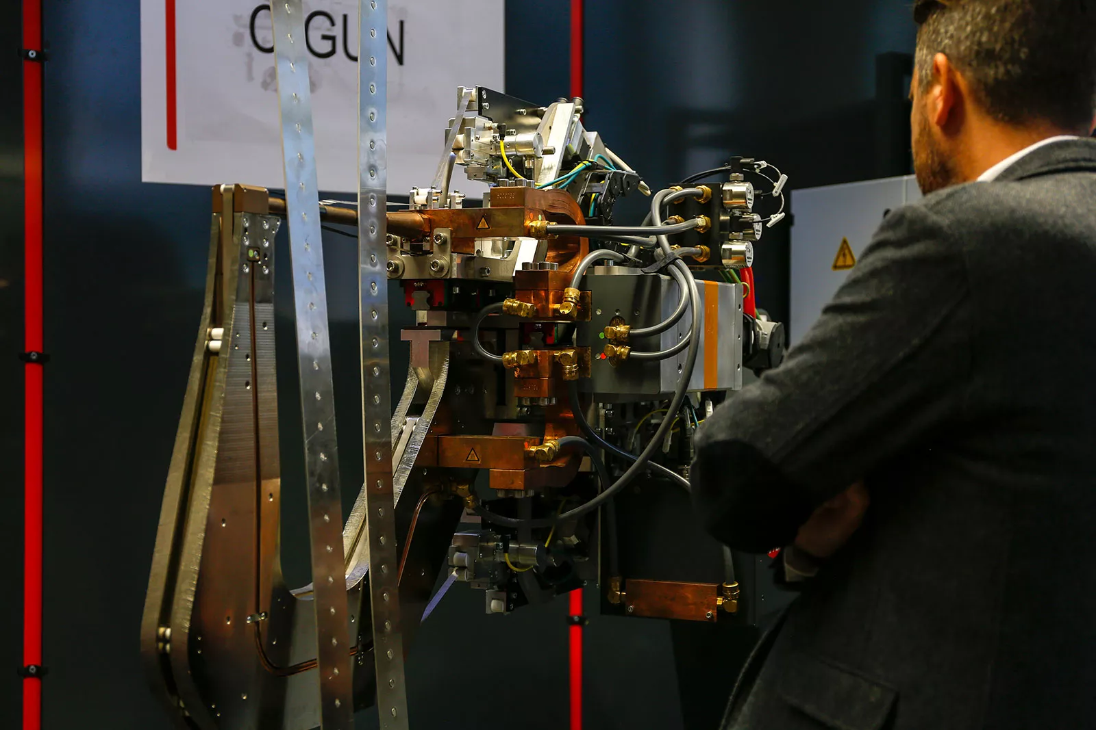 The speed with which the guns are moved by the robot, as well as the precision of the spot welding, are overwhelming! All in all, the RSW entrance show is reminiscent of real science fiction.