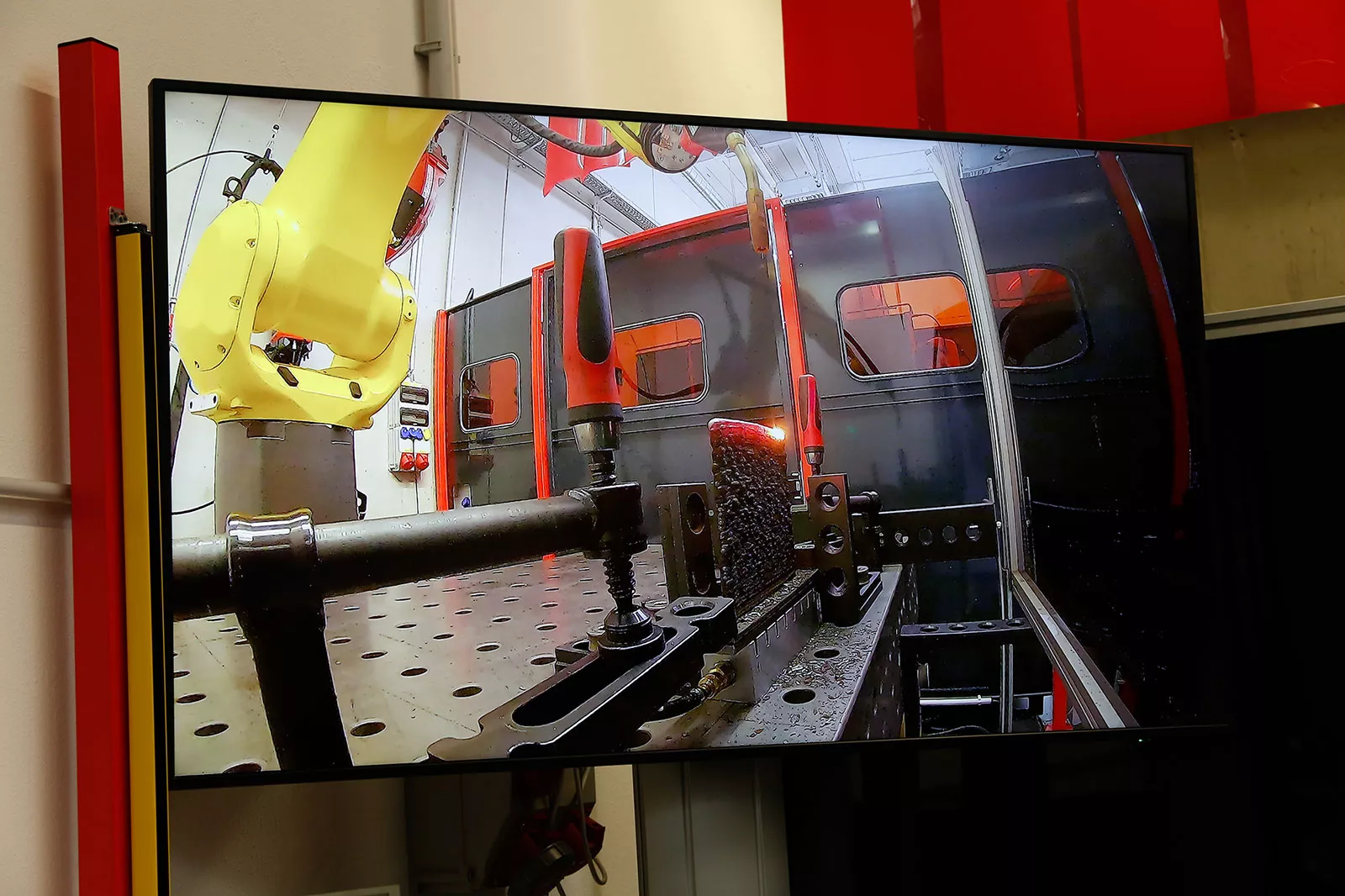 The Fanuc COBOT is a collaborative welding robot. On Product News Day, the COBOT traveled along a specified path – the length of a workpiece clamped onto a welding table, allowing all of the possible welding processes to be simulated. A number of plausible benefits that could be implemented into Fronius systems in the future became clear during the demonstrations – for example, during a safety demonstration, the COBOT stopped as soon as a person approached the process.
