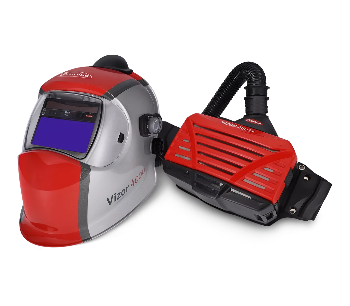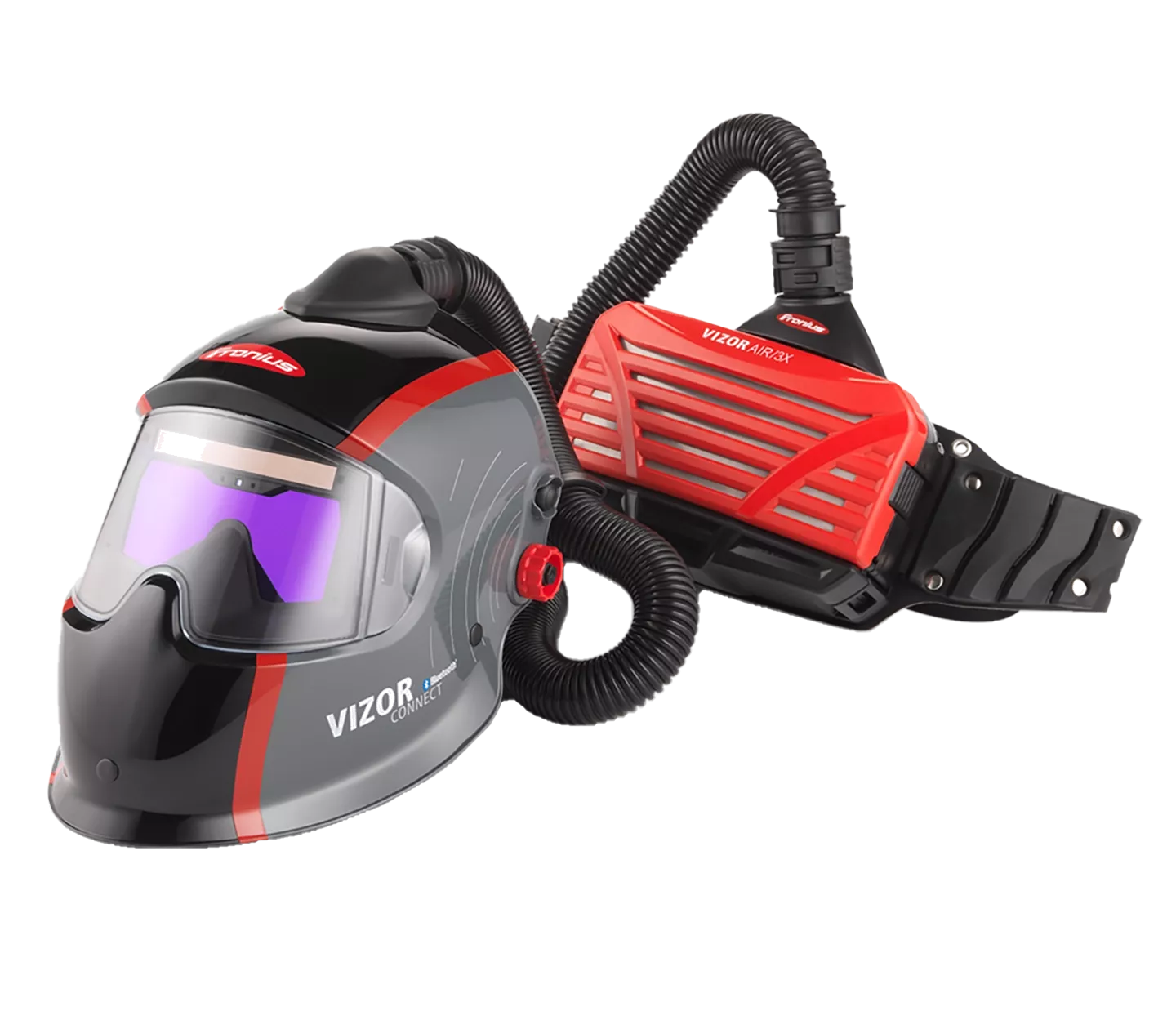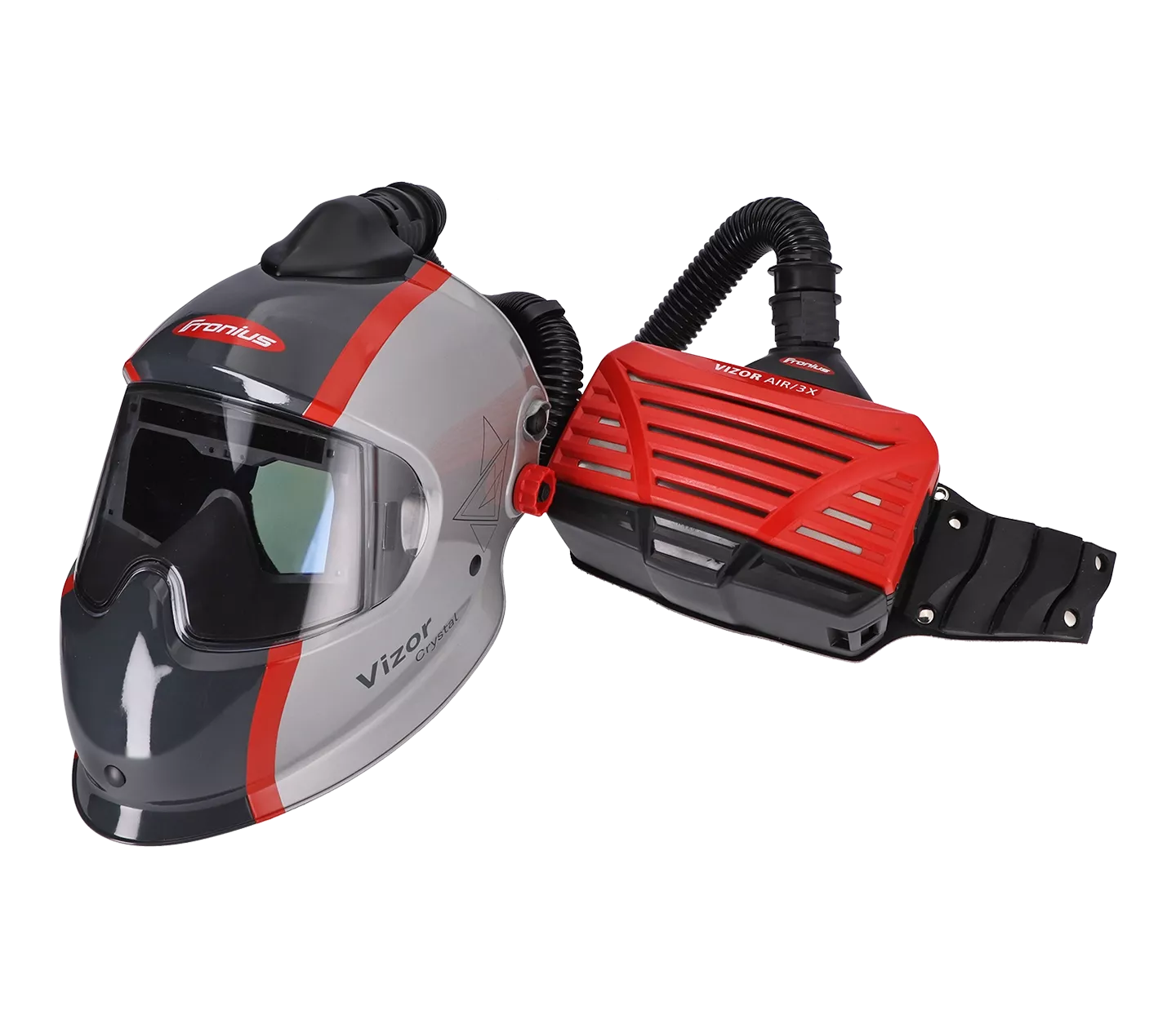 Our Vizor Air/3X PAPR system provides reliable respiratory protection during welding. It consists of a powered air-purifying respirator, air hose, and carry strap.
