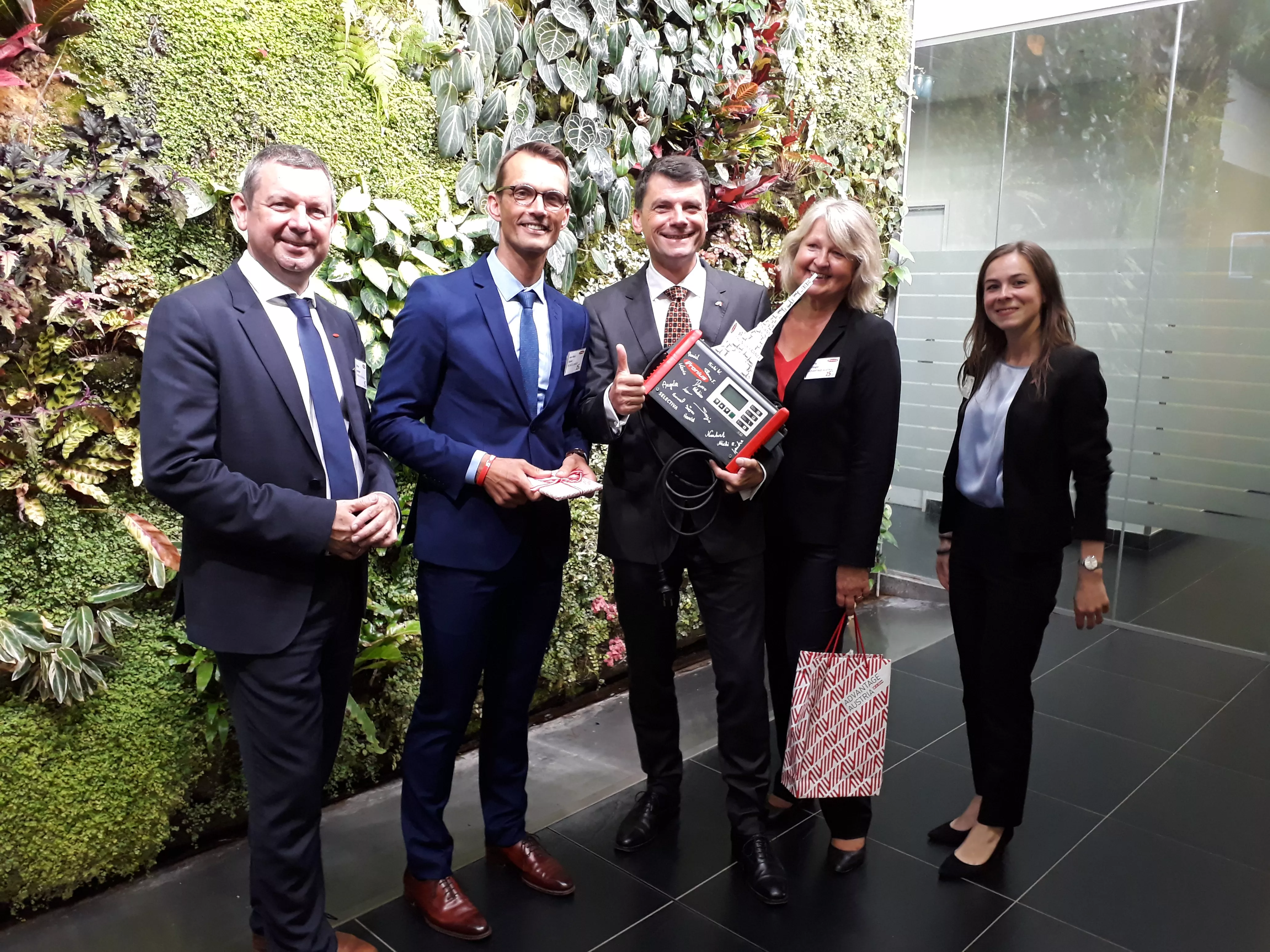 Monsieur Volker Lenzeder (Direction Fronius International), Jean-Marc Scolari (directeur général Fronius France), Christian Schierer (directeur ambassade d’Autriche) accompagné de Elisabeth Mindberger et Maria Zeilinger.