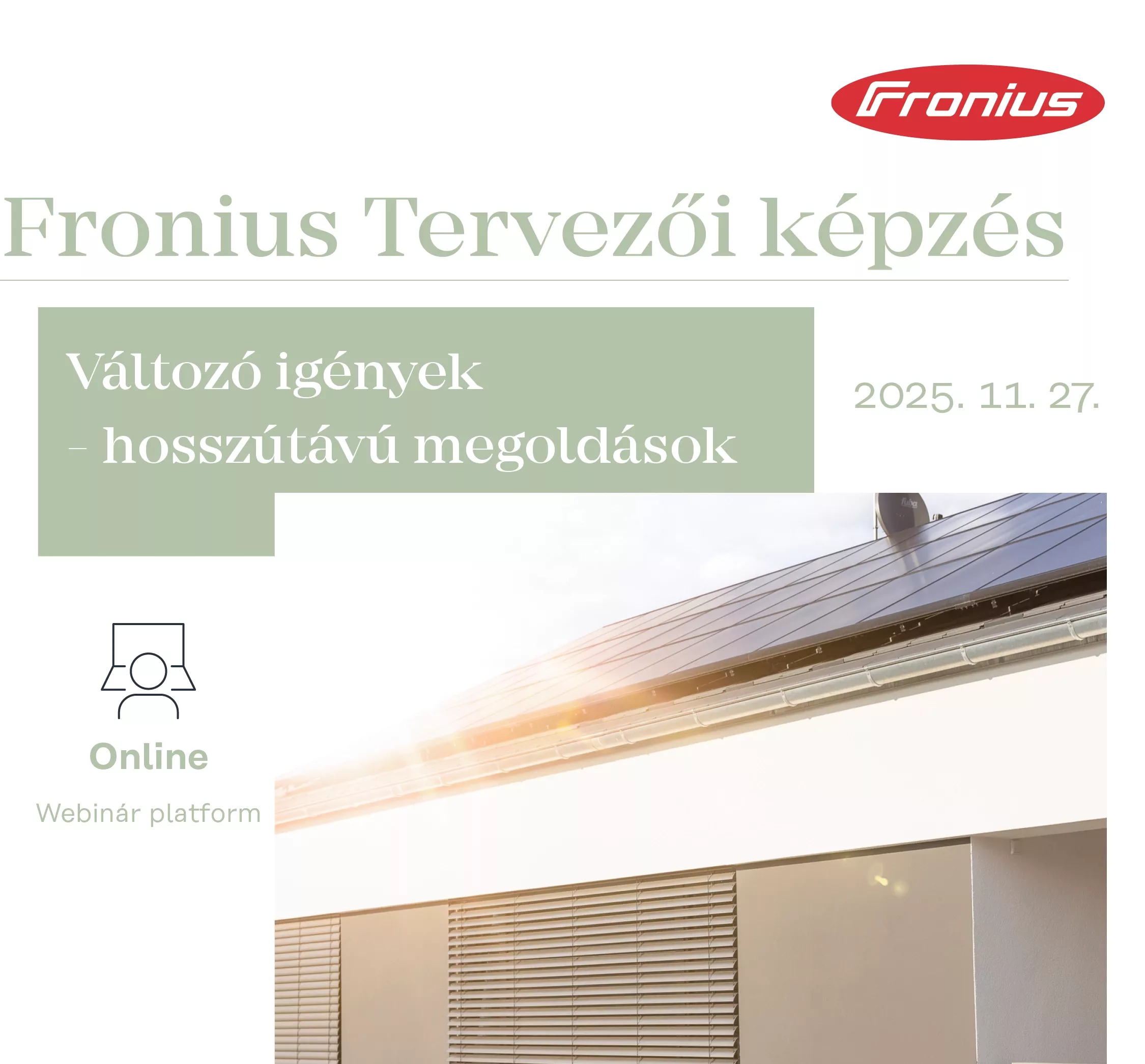 Sok szeretettel meghívjuk harmadik alkalommal megrendezésre kerülő Fronius tervezői képzésünkre. A képzés célja, hogy a tervezők megismerjék a gazdaságos és optimális rendszertervezési lehetőségeket, kihasználva a napelemes rendszerek komponenseinek lehetőségeit. A Fronius inverterek számos olyan egyedi tulajdonsággal bírnak, amelyeket mind lakossági, mind kereskedelmi célú rendszereknél optimálisan ki tudunk használni. A képzésen átfogó képet adunk a Fronius megoldásairól, támogatást nyújtva a tervezői munkához.