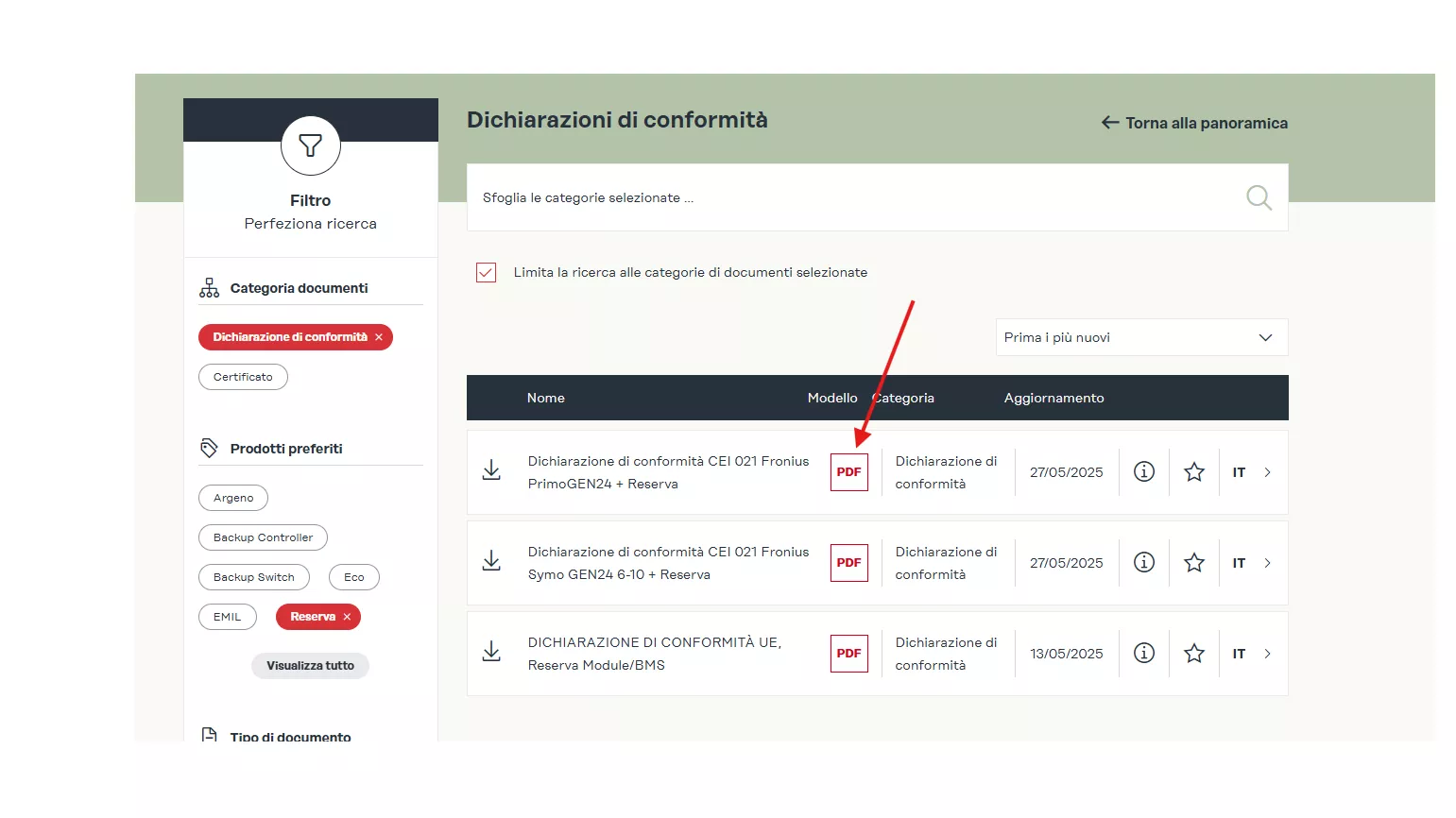 Usa i filtri sulla sinistra per scegliere la categoria del documento e/o la tipologia di prodotto (es. GEN24, Reserva, Argeno).