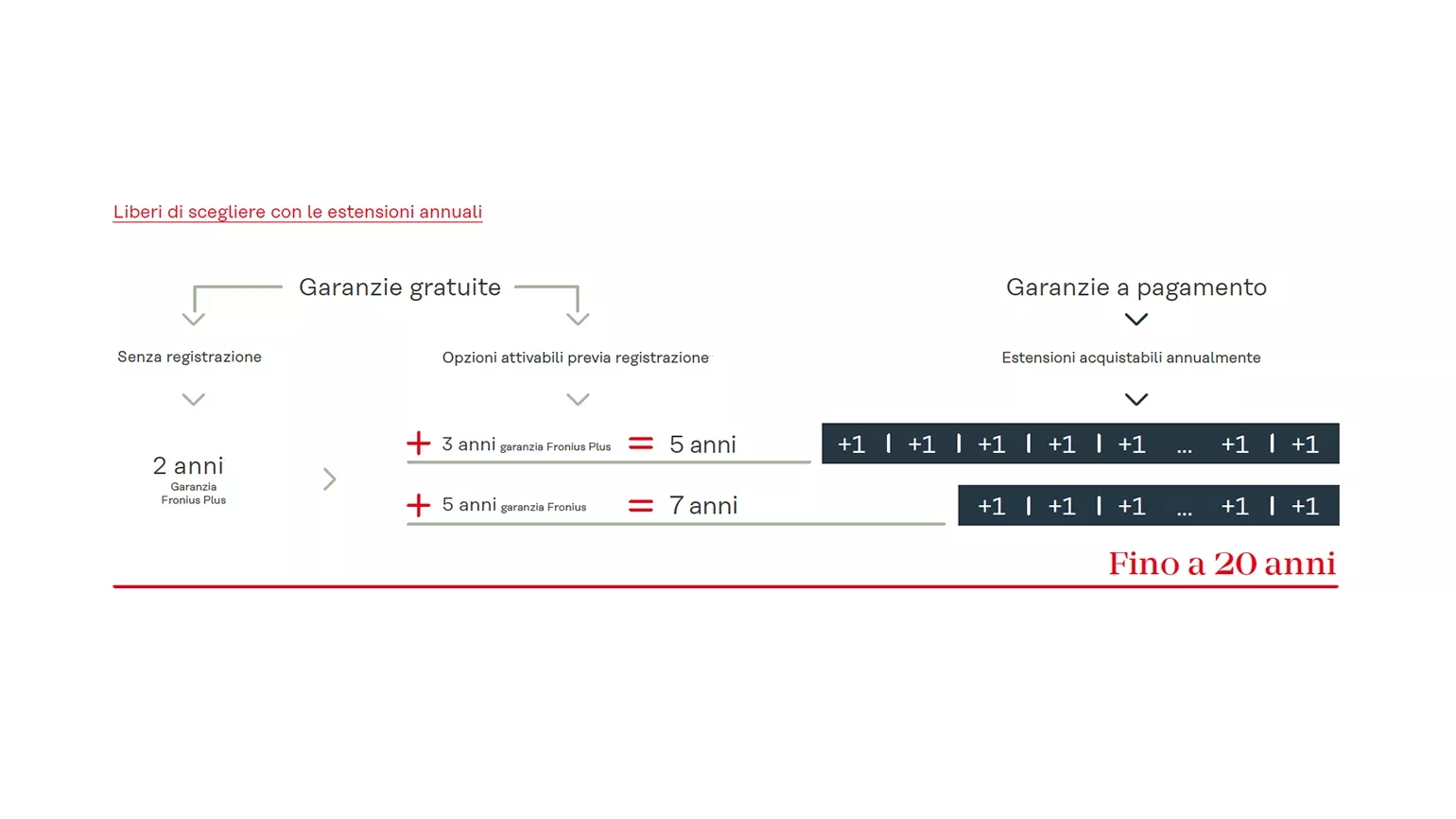 - la Garanzia Fronius, che offre 5 anni gratuiti di copertura parziale al termine dei 2 anni previsti per legge.
