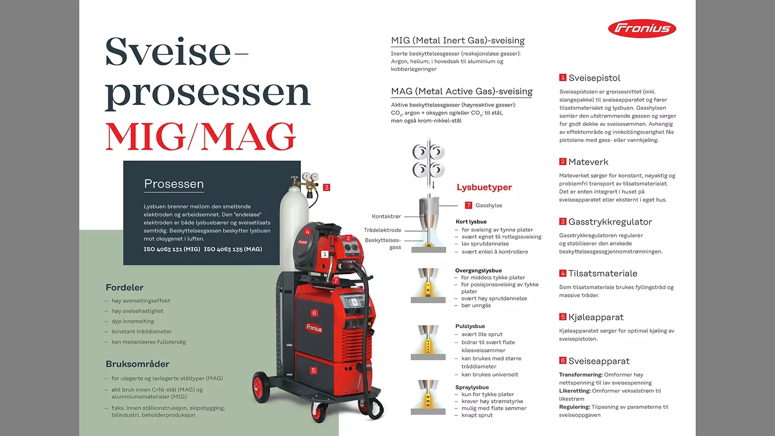 Plakaten byr på grunnleggende kunnskaper om sveiseprosessen MIG/MAG.