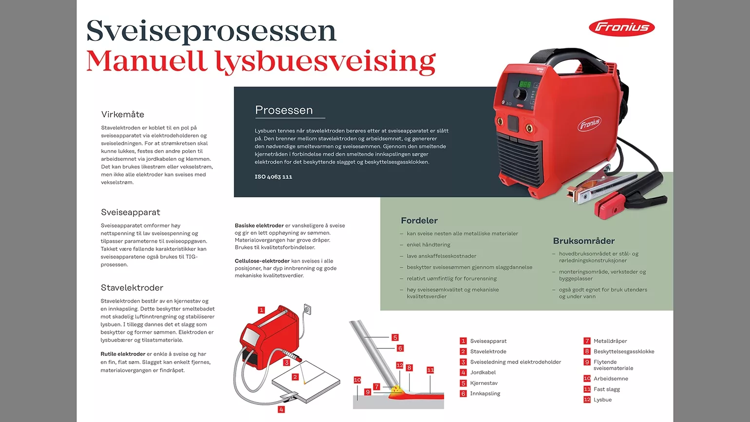 Plakaten byr på grunnleggende kunnskaper om sveiseprosessen elektrodesveising.